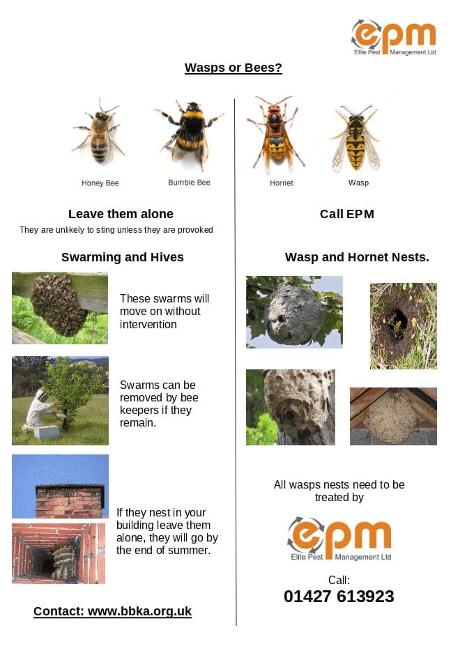 Honey Bees– These are the kind kept by Bee Keepers, although they can live in the wild in hollow trees or in chimneys, wall cavities or roof spaces. They are similar in size to wasps but are furrier and mostly black in colour. It is the Honey Bee that converts nectar into honey and beeswax and is known to swarm. A Honey Bee swarm will arrive in flight and cluster on a tree branch. The noise can be alarming, but the danger is not great if you keep your distance and contact a local bee keeper or Environmental Health Department as they will be able to arrange for the swarm to be relocated.